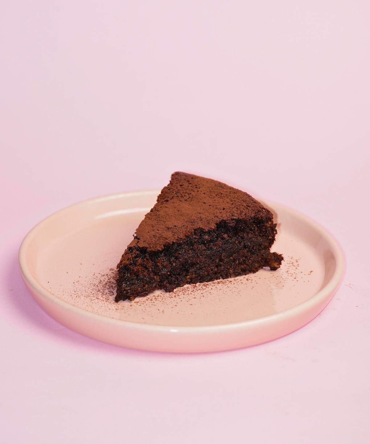 A flourless chocolate cake made with ground almonds, beetroot, Sugar, eggs & cacao.